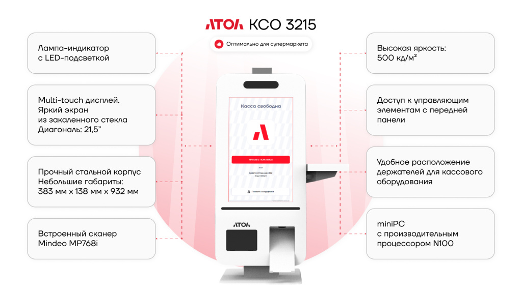 АТОЛ КСО 3215 — обновленная и улучшенная касса самообслуживания (КСО). Сократит ваши затраты на привлечение персонала и увеличит лояльность ваших покупателей. Идеально подойдет магазинам у дома, мини-маркетам, заправкам, ресторанам, кафе и другим точкам с маленькой площадью.